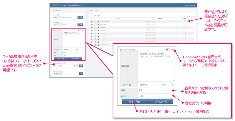 ビーウィズで提供しているOmnia LINKは、いち早くGoogleの音声合成API:Text-to-Speechを搭載し、システムに案内文を入力するだけできれいな音声を作ることができる機能が搭載されていました。