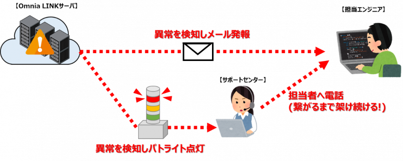 Omnia LINKのシステムは、死活監視やリソース監視、アプリケーション監視などを常に行っており、何か異常を検知した場合には、担当エンジニアチームへメール発報される仕組みとなっています。しかしながら、この自動化された仕組みにも「担当者がメールに気付かない可能性がある」という欠点があります。