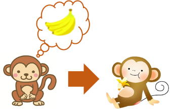 サルはバナナ好きという仮定のもと、この絵のようにサルにバナナを食べてにっこりしてもらうためには、どのような策があるのか?