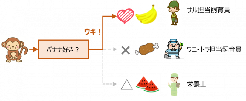 おサルさんがバナナをもらったのはサル担当飼育員ですが、それ以外にワニ・トラ担当飼育員と栄養士がいます。