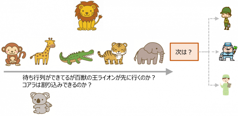 どっしり構えたゾウさんがようやく待ち行列の先頭に来ましたが、ガオガオ吠えているライオンを優先したり、首を長く待ち続けているキリンの前にコアラが割り込んだり、といった具合です。