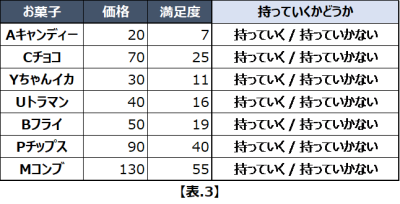 「Yちゃんイカ、Bフライ、Pチップス、Mコンブ」の4つを持っていくとき、満足度が一番高くなる(満足度:125)となります。