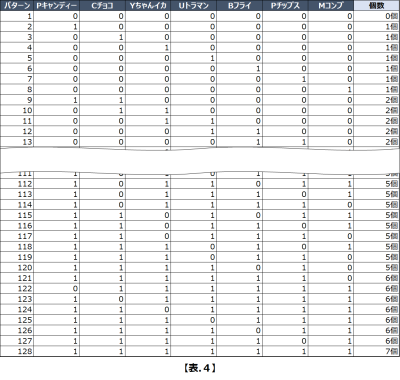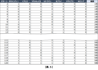【表.4】の個数を1個から5個までにフィルター(127通り⇒119通り)