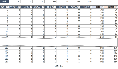 【表.6】までで、試算する組み合わせに対する「制約条件」は全てかけ終わったので、この中から「成果を最大化する」パターンを見つけます。