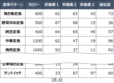 今回はダミーデータですが、この問題設定の場合、【表.8】のようなデータがあれば、例①と同じような手法を使って、『なるべく好みのものを食べながら、栄養素を確保でき、カロリーも抑えることができる』ダイエット計画を立てることができます。