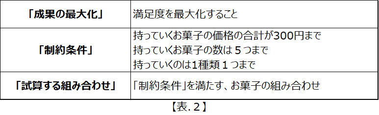 また、上記の「成果の最大化」「制約条件」「試算する組み合わせ」についてまとめると、【表.2】のようになります。