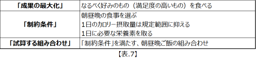 その上で例①と同じように、「成果の最大化」「制約条件」「試算する組み合わせ」についてまとめると【表.7】のようになります。