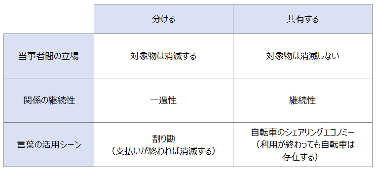 この関係性は「分けること」と異なり、共同で利用しているので「共同で利用したこと」によって、対象物は消滅せず継続的である、ということが大きな特徴であろうと思います。