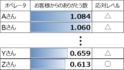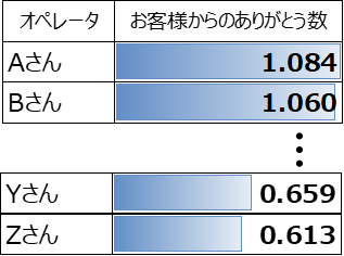 そして、オペレーターごとの「ありがとう」数を多い順に並べてみると、トップは1以上、最下位は0.6台という結果でした。