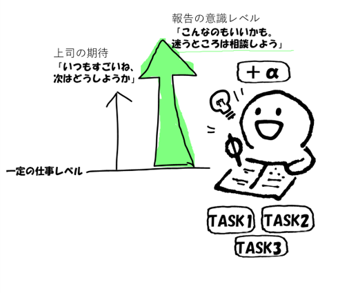 私も、上司から“今すぐ今日の成果報告をせよ“といわれたら、「?」と思われることを懸念し、上記の曖昧な部分ではなく、【研修企画】などそれっぽく概念化してみたり、【研修受講履歴管理】など他の定型タスクをメインに打ち出した報告にしてしまうと思います。