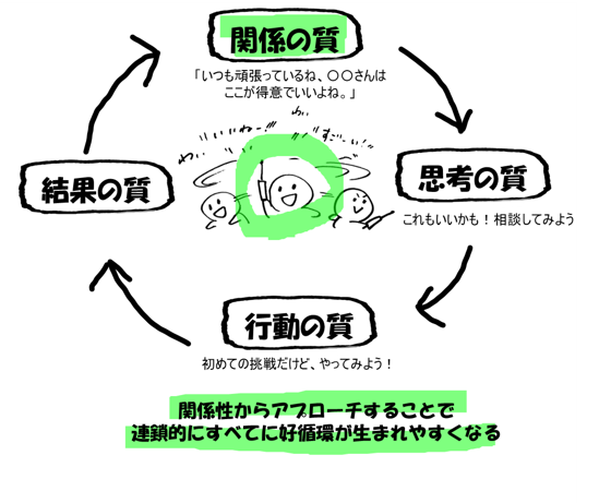 さらに前述の理論は、この4つのサイクルの考えはそのままに、スタート地点を【関係の質】にすることで好循環を生み出すという考えを提唱しています。
