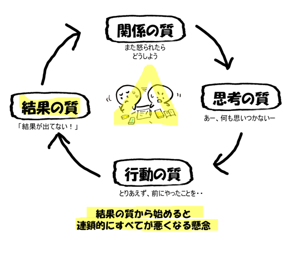 しかし、同じ4つのサイクルにもかかわらず、【結果の質】を優先的に考え、結果のフィードバックから入ると、上の図のような悪循環に繋がることがあるといいます。