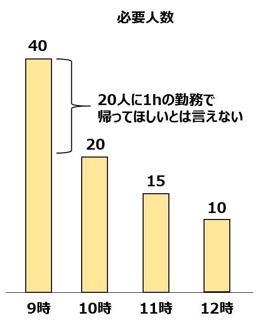 そうなると、実際には9時から13時まで40名人を配置し、10時台で20名、11時台で15名、12時台で30名の余剰人員が出ることになります。