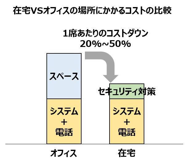 当社の1席あたりのコストシミュレーションだと、当社拠点内の機材コスト+場所コストよりも、在宅での機材コストの方が20%~50%程度安くなります。自社のコールセンタースペースを削減して、在宅に切り替えることができれば、追加コストはなく、コストの削減ができる上に事業継続の安全性の強化もできるという「良いとこ取りの仕組み」です。