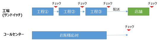 コールセンターでの応対 = 製品と置き換えて考えると、お客様とオペレーターが一対一で話して、その場でサービスが提供されるため、お客様の手元に製品が渡った後にしかチェックができません。ここが、工場との違いの一つです。