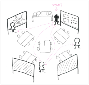 「昨日話したことと同じことですね」と耳で聞くだけでなく、昨日と同じ方角にある同じ図を見ることで反復効果が高まる。