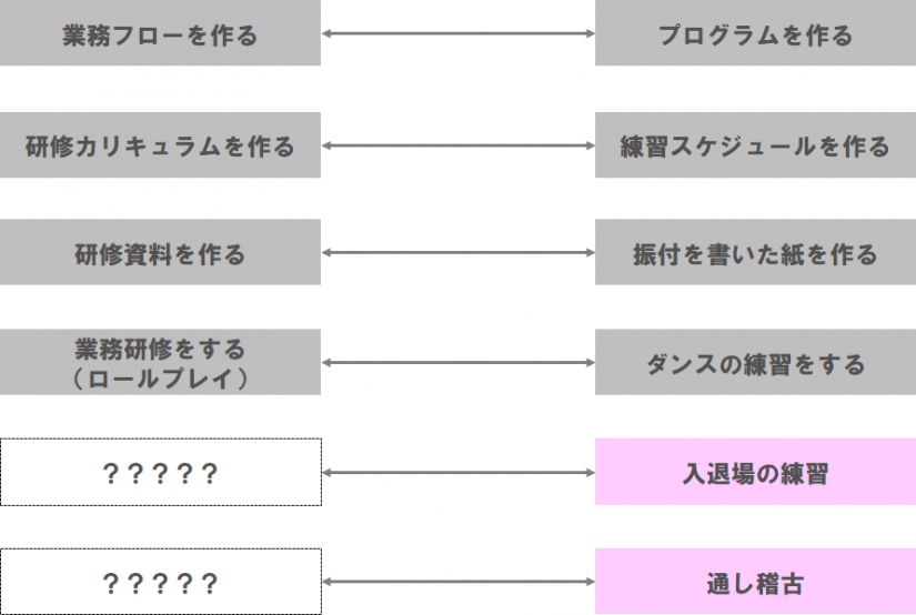 すべての工程をノンストップで通して練習することで、「この数秒では移動が間に合わないね。だから小道具はこの場所に移動しなければ」とか「あれ、マイク誰も持ってなかったね」とかを確認しているわけである。