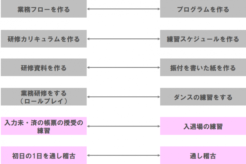 センターの立ち上げというのは膨大な作業に忙殺される。複数ある仕事の中で、本日は業務フロー設計の部分を例として、運動会のダンスの練習と対比させながら説明していく。