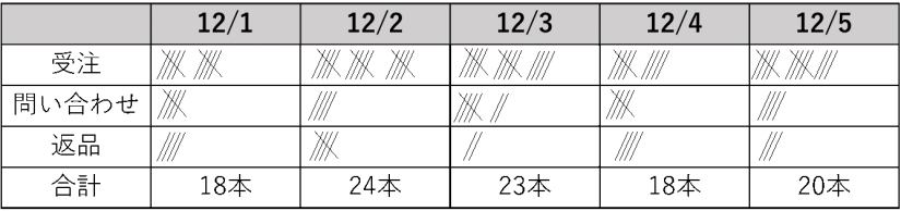 定性データは数字でとれないため、観察して数量を計測し、分析をする必要がある。そのためにチェックシートを用いて数量を計測するという手法が使われる。コンタクトセンターでよく使われるのは、新人オペレーターの受電件数管理や、新人のスーパーバイザーのエスカレーション記録などだ。