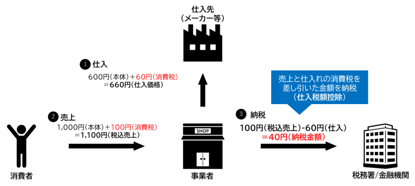 事業者は、その事業で得る ②消費者からの税込売上から、①仕入先に支払った消費税を差し引いた金額、つまり ③仕入税額控除を受けた金額を納税する事となります。