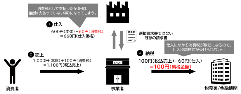 適格請求書による運用(発行・管理)が行えない場合、仕入税額控除が受けられないと説明しましたが、具体的には仕入先に対して消費税を支払っていない事となり、事業者として納税額が増えてしまう事を指しています。