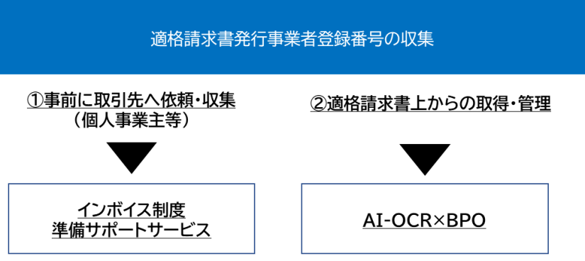 特に、適格請求書発行事業者登録番号収集を起点とし、大きく2パターンのサービスを用意しています。