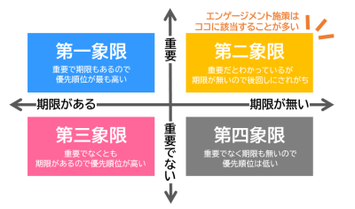 エンゲージメント施策は、かの有名な優先順位の四象限にあてはめると、下図の第二象限に当てはまる。