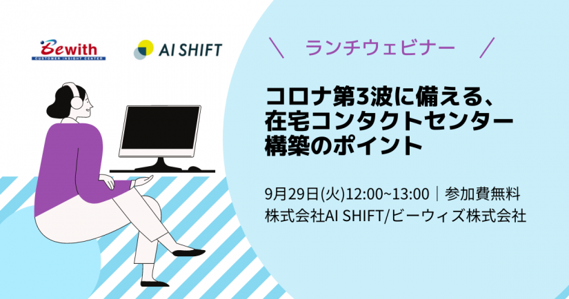 ビーウィズ株式会社(本社:東京都新宿区、代表取締役社長 森本 宏一) は、株式会社AI Shift様と、オンラインセミナー「コロナ第3波に備える 在宅コンタクトセンター構築のポイント」を開催いたします。