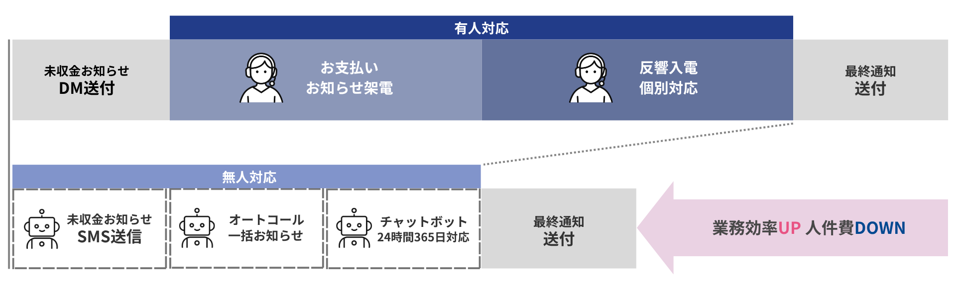 センシティブな支払いリマインドのフローを最大限無人化し、マルチチャネルで対応することで、顧客の利便性が向上。さらには、業務効率化と人件費削減も同時に実現します。