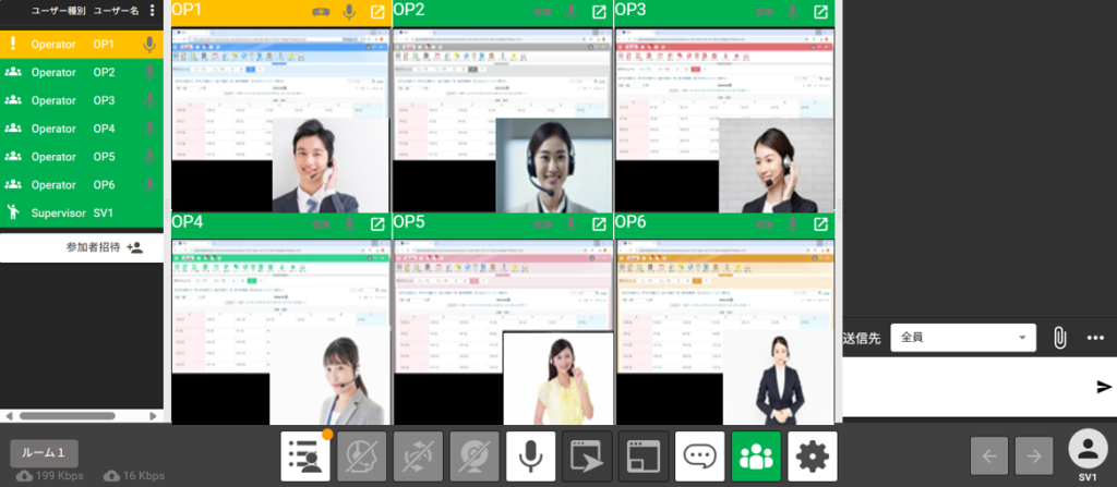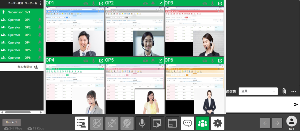 こちらは、講師側から見た画面になります。グループに招待されているメンバー全員で会話ができる「カンファレンス機能」を利用している状態です。利用中は参加者の画面上とユーザーリストが緑色になります。