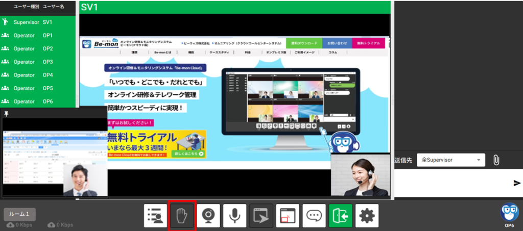 画面左下の手のマーク(エスカボタン)を押すと、受講者は講師へヘルプ依頼ができます。