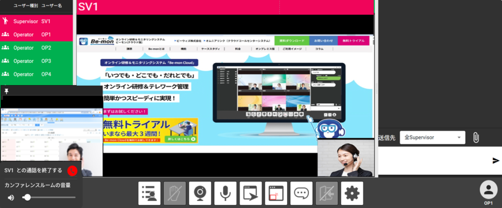 1対1の音声通話は、研修全体の音声も音量調節して聞くことができるため、全体の進捗も確認しながら通話が可能です。